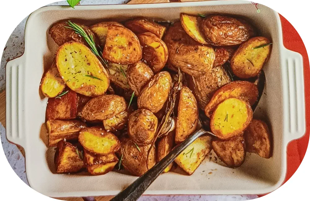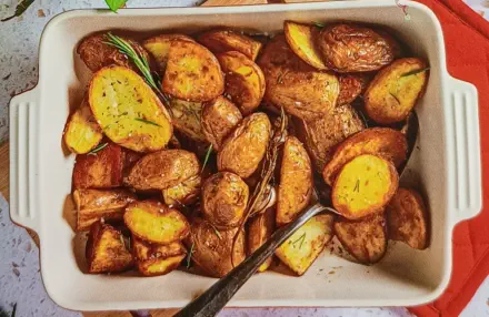 Toss the potatoes with the melted butter, unpeeled garlic cloves and sprigs of rosemary. Sprinkle with salt and pepper and spread the potatoes over the baking dish.