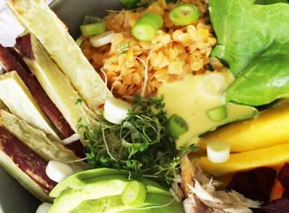 For the Feel Good Bowl, use a round, deep plate. Prepare the bowl by placing and tear into the lettuce on the plate first. Spoon in the lentils, followed by the sweet