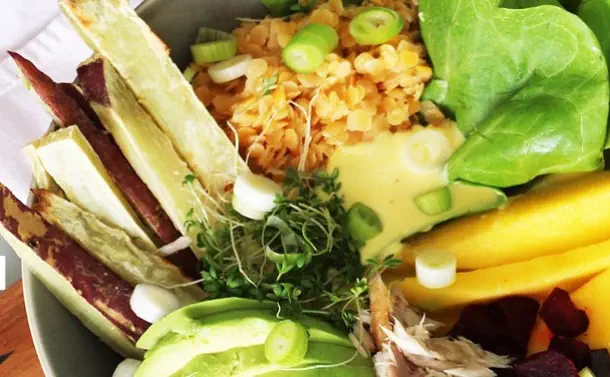 potato, beetroot, mackerel, mango and avocado. Spoon in 3 tablespoons of the sauce and sprinkle the bowl with the strips of spring onion and cress..