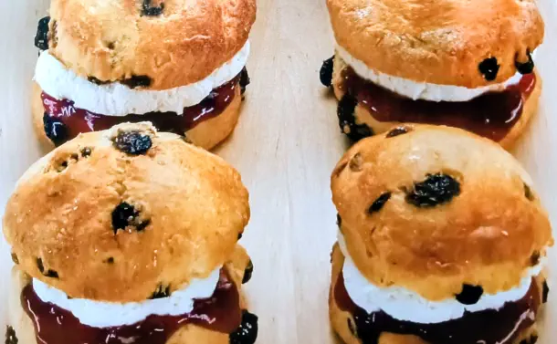 When sufficiently cooled, cut the scones in half and fill them with jam and whipped cream.